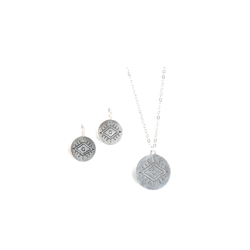 Collier et boucles d’oreilles argentées avec pendentif oeil